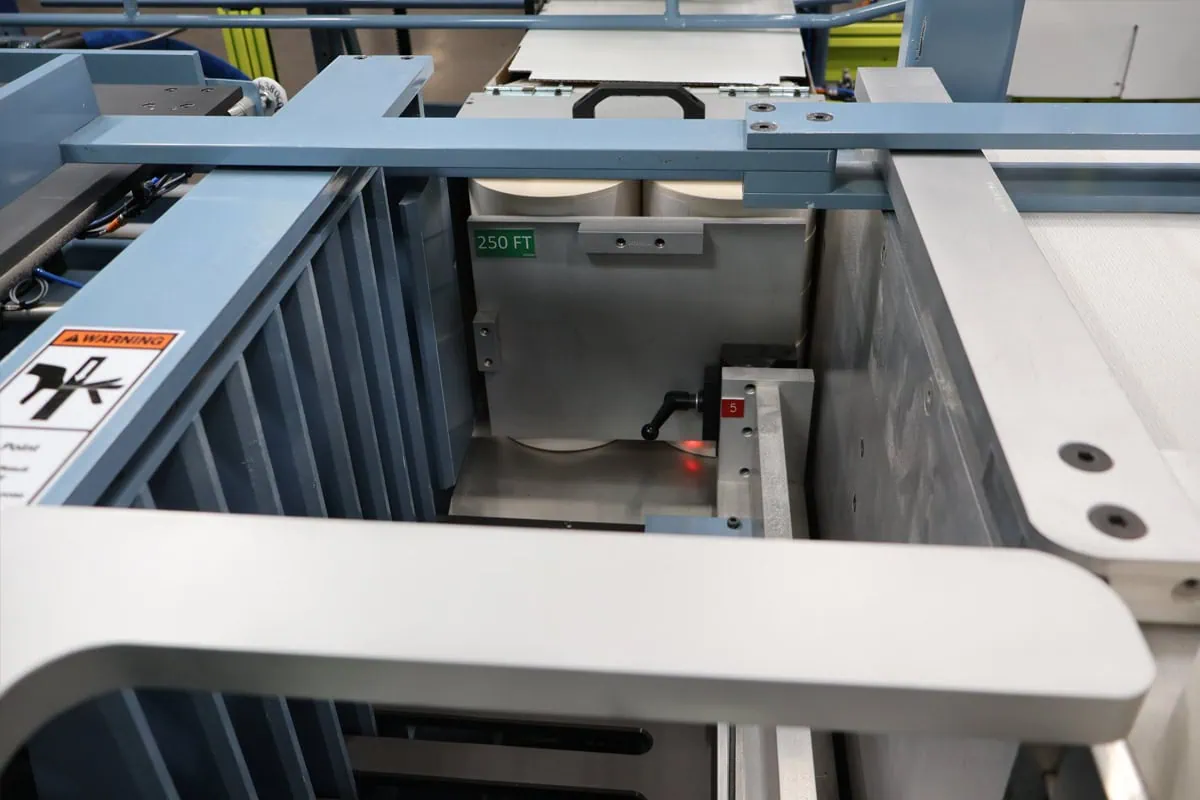 A horizontal magazine automatically feeds and opens cases using pneumatically actuated suction cups, while finished rolls are conveyed into the machine and guided for consistent alignment. Servo-driven stations form precise layer patterns and load the completed stack into each erected case. The flaps are then automatically folded and sealed with a Nordson Hot Melt Glue System, which maintains optimal adhesive consistency through precise temperature control and an auto-fill feature that keeps the glue tank full for uninterrupted operation.